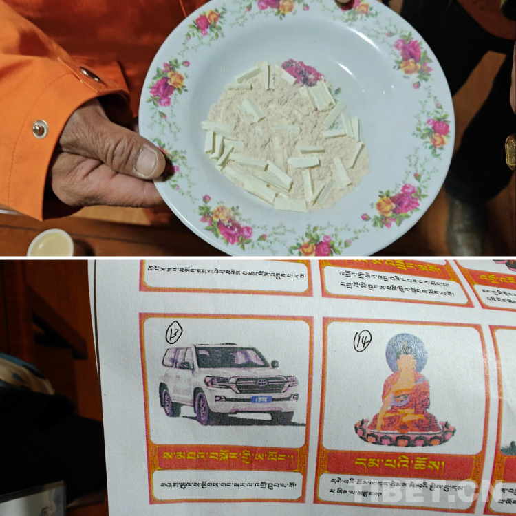 為了增添一些節(jié)日的氣氛,幾位道班大哥為我們準(zhǔn)備了別具特色的“抽簽”式古突。大家從盤子里抽取印有數(shù)字的標(biāo)簽紙,然后根據(jù)數(shù)字從解析書里找出對應(yīng)的圖案和文字解釋,寓意著新年會有不同的收獲。兩位同事抽到了取火器和黃財(cái)神,解讀說是能干和發(fā)大財(cái)。而我抽到了一輛“霸道車”,道班大哥說意味著新的一年我能去周游世界。每抽完一個(gè)簽,大家都會叫好和鼓掌,給抽簽人送去美好的新年祝福。
