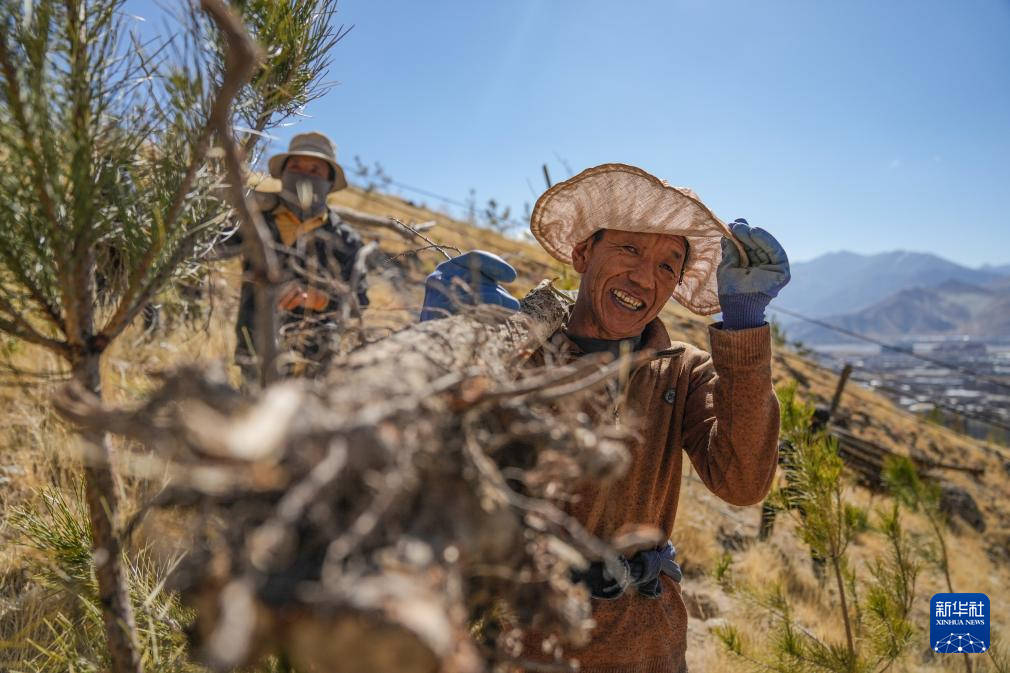 3月12日,東嘎社區(qū)二組村民在搬運(yùn)樹(shù)苗。新華社記者 丁增尼達(dá) 攝 ??