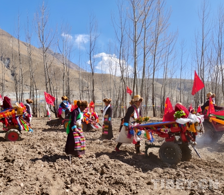當(dāng)天,村里的男女老少穿上節(jié)日盛裝,手捧哈達(dá),高舉青稞美酒,從村子的各個(gè)角落來(lái)到村東頭一塊叫作“聶西滅”的肥沃土地上,男人們駕駛著用彩旗、花束妝點(diǎn)的拖拉機(jī),伴隨著一陣陣轟鳴聲,春耕儀式正式開始。新耕的第一犁,由一個(gè)屬相與今年屬相相符的婦女撒出吉祥、幸運(yùn)的種子,其余的拖拉機(jī)一對(duì)跟著一對(duì)地翻耕,每臺(tái)拖拉機(jī)后面都跟隨著一位盛裝的婦女,她們左手提一桶種子,右手有節(jié)奏地?fù)]擺,翻出沉寂一冬、透著泥土芬芳的肥沃土地,把種子撒入希望的田野。翻耕結(jié)束后,各家各戶把春耕歡慶時(shí)用的青稞酒、卡賽、切瑪?shù)葦[放在供桌上,孩子們?cè)谔镩g喧鬧戲耍,將村民們其樂融融、喜氣洋洋的美好生活景象體現(xiàn)的淋漓盡致。