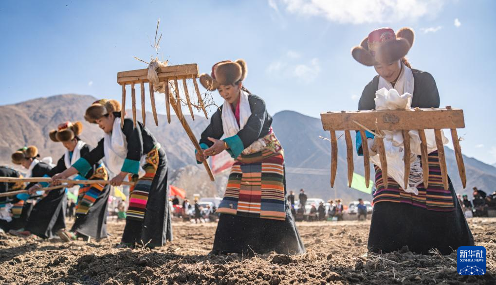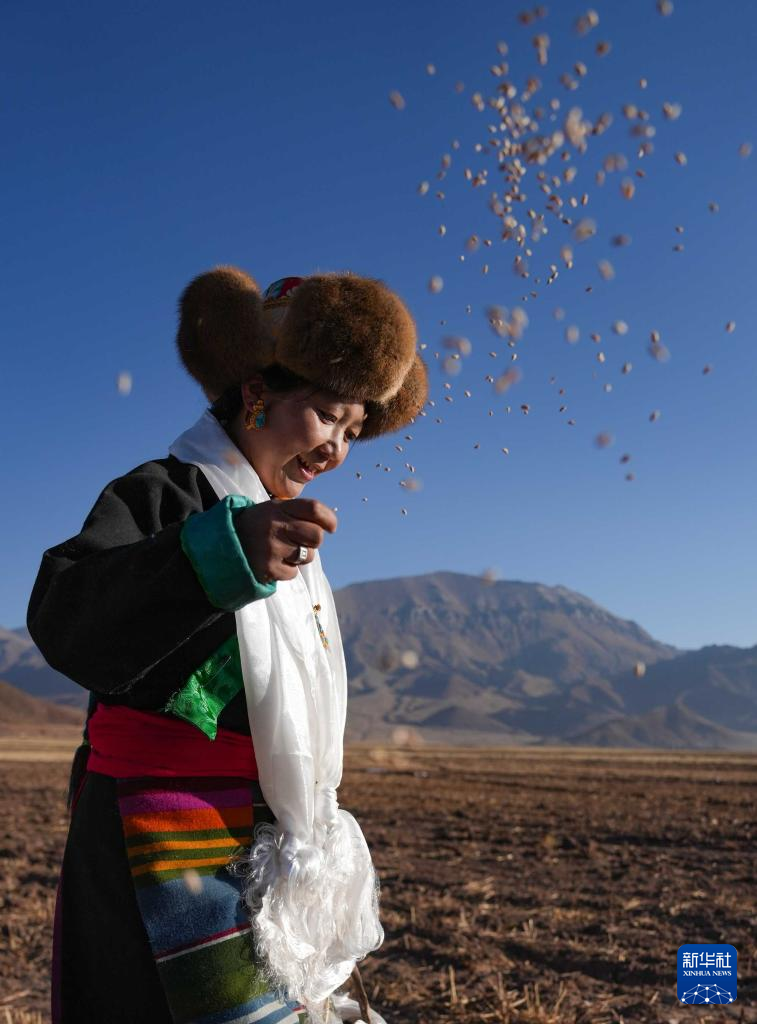 當(dāng)日是西藏農(nóng)民舉行一年一度春耕大典的日子。村民沿襲著傳承千年的春耕民俗,身著節(jié)日盛裝,手捧“切瑪”(五谷豐登斗),唱起祈愿歌,互敬青稞酒。當(dāng)鐵犁翻開土地,婦女將手中的種子撒下,祈求新的一年豐收?! ??