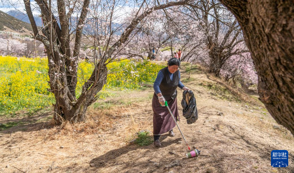 尼瑪曲吉在嘎拉村桃花園里撿拾垃圾(4月1日攝)。新華社記者 丁增尼達(dá) 攝