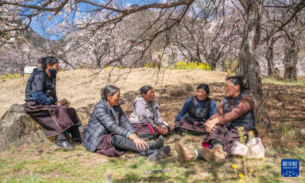 午休時(shí),尼瑪曲吉(右二)與村民在桃樹(shù)下聊天(4月1日攝)。新華社記者 丁增尼達(dá) 攝