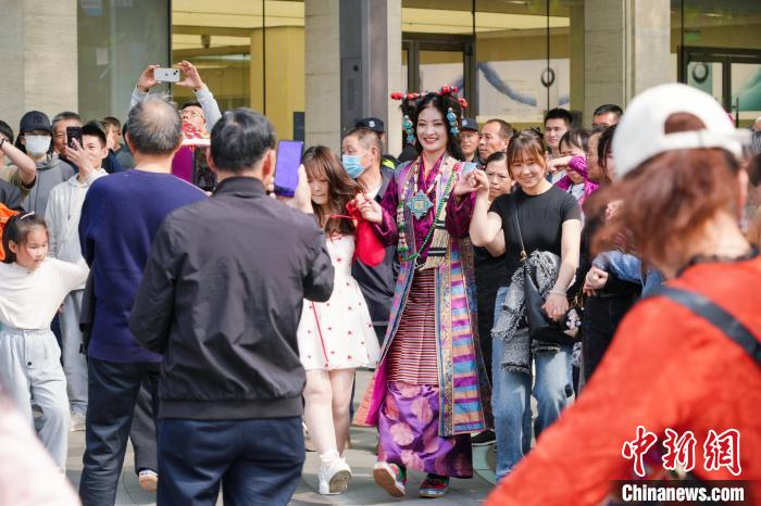 此次文旅推廣活動中,主辦方在西子湖畔舉辦了一場藏裝時裝秀,十多位拉薩市當(dāng)雄縣藝術(shù)團的演職人員身著各式藏裝獻(xiàn)上文藝表演、時裝走秀,吸引廣大游客駐足參與互動。