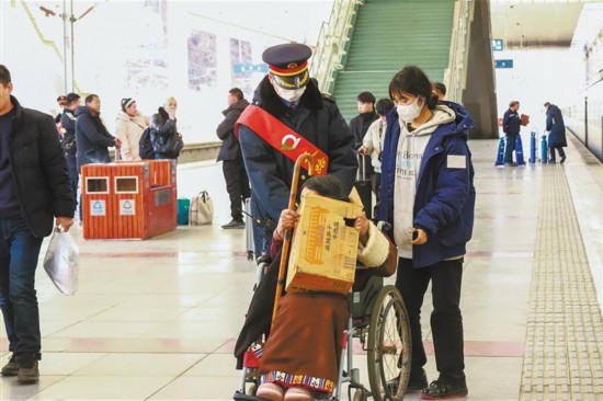 圖為拉薩車站“天路格?;ā鼻嗄曛驹阜?wù)隊工作人員為旅客服務(wù)。 孫皓 記者 丹增群培 攝