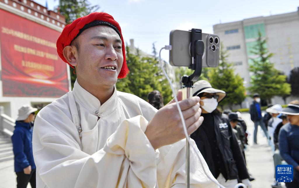?5月12日,在西藏職業(yè)技術(shù)學(xué)院職業(yè)教育活動周啟動儀式暨比如縣非物質(zhì)文化遺產(chǎn)進校園活動上,來自比如縣的一名旅游推介者在做現(xiàn)場直播。新華社記者 張汝鋒 攝 ??