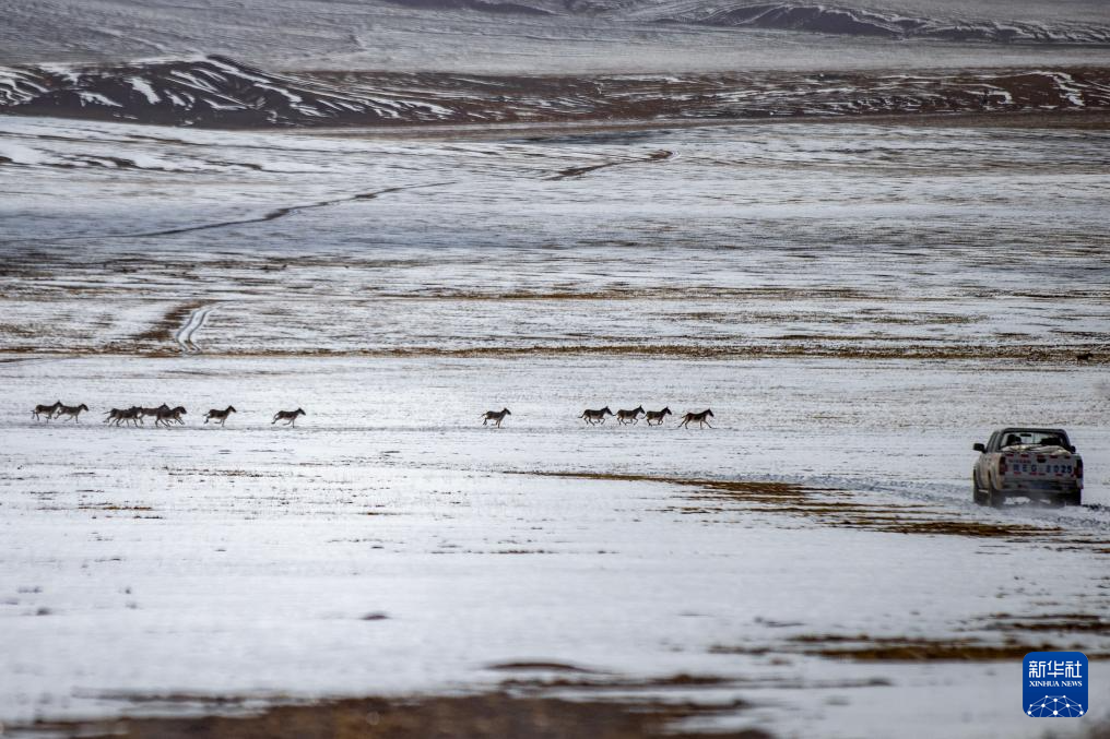 成群的藏野驢從野生動物專業(yè)管護(hù)隊員們的車前跑過(5月9日攝)。新華社記者 姜帆 攝 ??