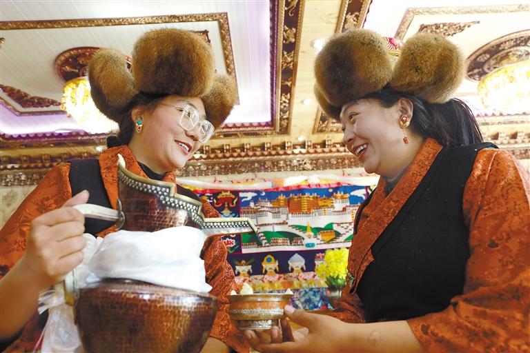 墨竹工卡縣甲瑪鄉(xiāng)孜孜榮村村民在藏歷新年互敬青稞酒。