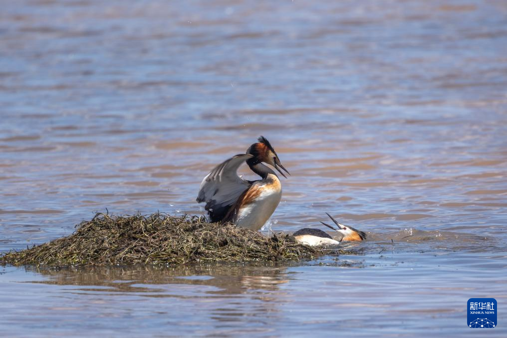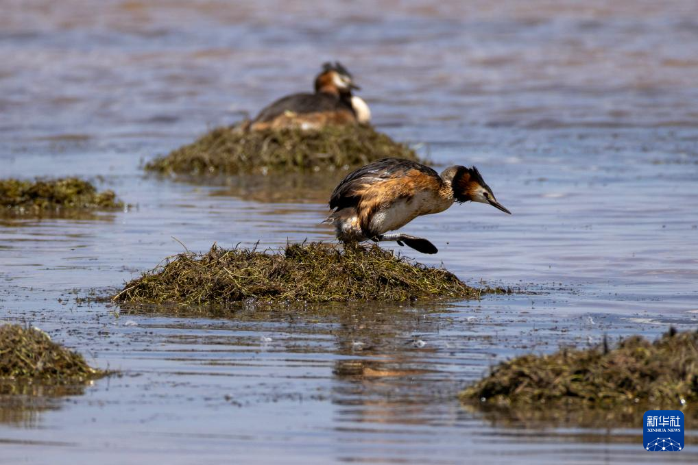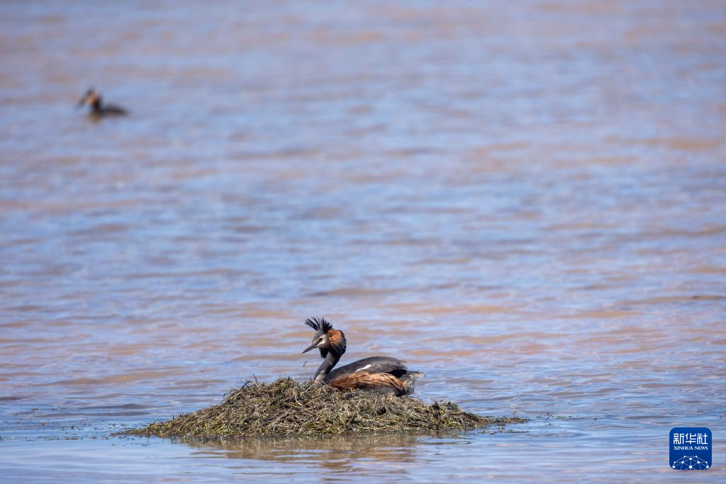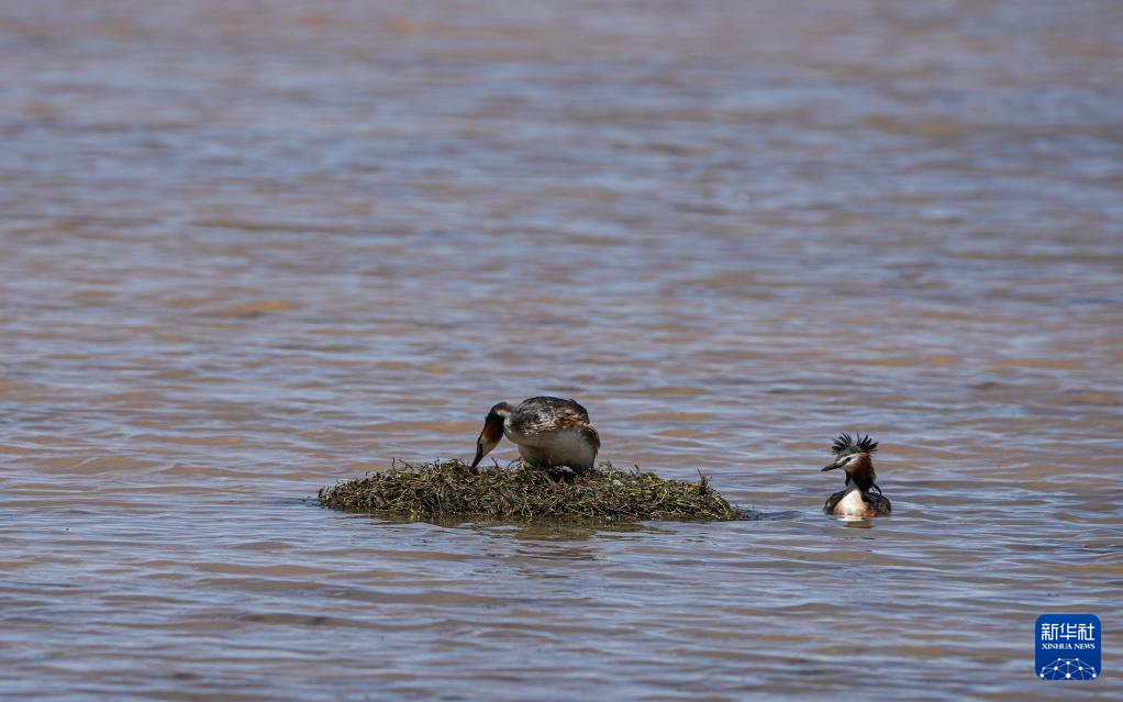 時值初夏,一群鳳頭鸊鷉在西藏自治區(qū)那曲市申扎縣下過鄉(xiāng)格仁錯旁邊的濕地營巢孵卵,準備迎接新生命的誕生。
