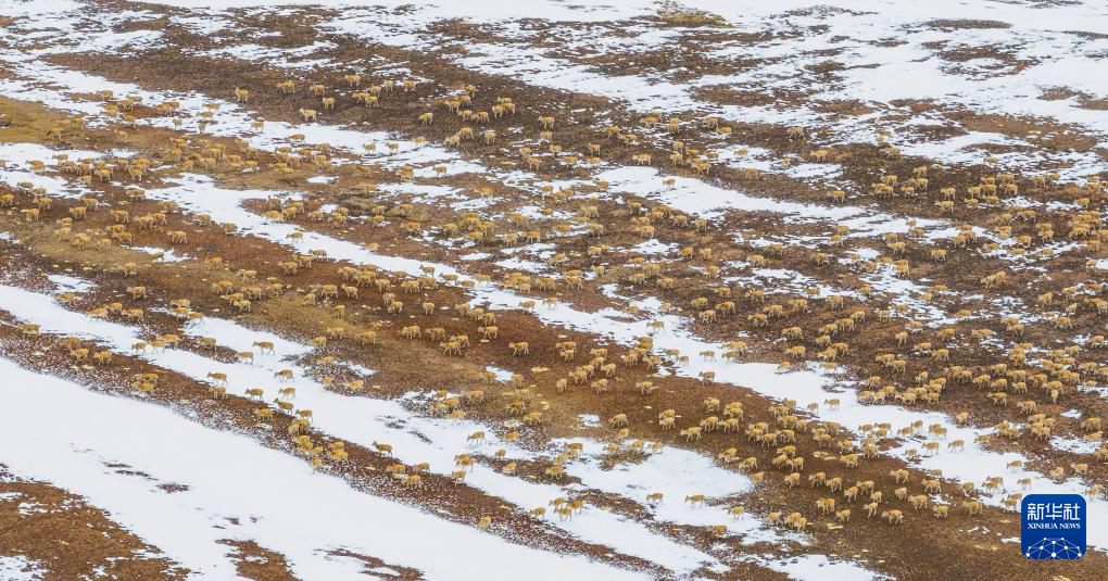 在甜水河畔荒灘雪地中向產(chǎn)羔地遷徙的藏羚羊(6月15日攝,無人機(jī)照片)。新華社記者 晉美多吉 攝