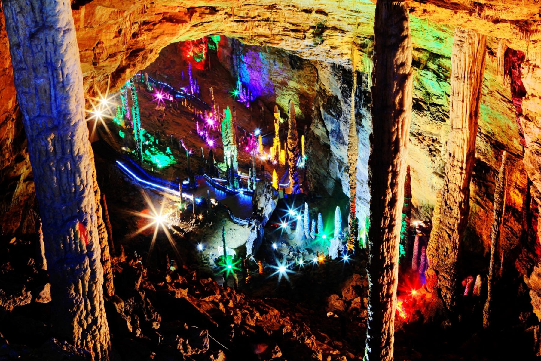 黃龍洞于1984年正式對外開放,現(xiàn)已探明的洞底總面積達(dá)10萬平方米,全長7.5公里,垂直高度140米,上下共分四層。其規(guī)模之大、鐘乳石之多、形狀之奇,在國內(nèi)外溶洞中極為罕見,被中外溶洞專家贊譽為世界溶洞的"全能冠軍"。