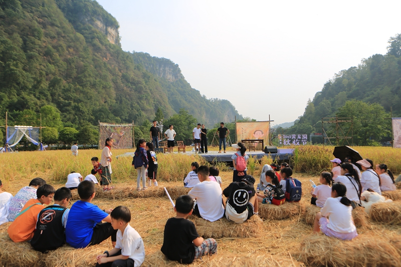 除了稻谷收割勞作體驗(yàn)、勞動實(shí)踐這一常規(guī)保留項(xiàng)目外,第三屆黃龍洞秋收節(jié)還舉辦了包括稻作研學(xué)、稻田集市、田園音樂會、非遺文化體驗(yàn)、戲劇藝術(shù)展演等豐富多彩的活動。在為期五天時(shí)間里,吸引了三萬多客人從四面八方趕赴過來。大家歡聚在黃龍洞外山谷的金色田野里,一起體驗(yàn)勞動的快樂,感受豐收的喜悅,樂享戶外親子休閑生活。
